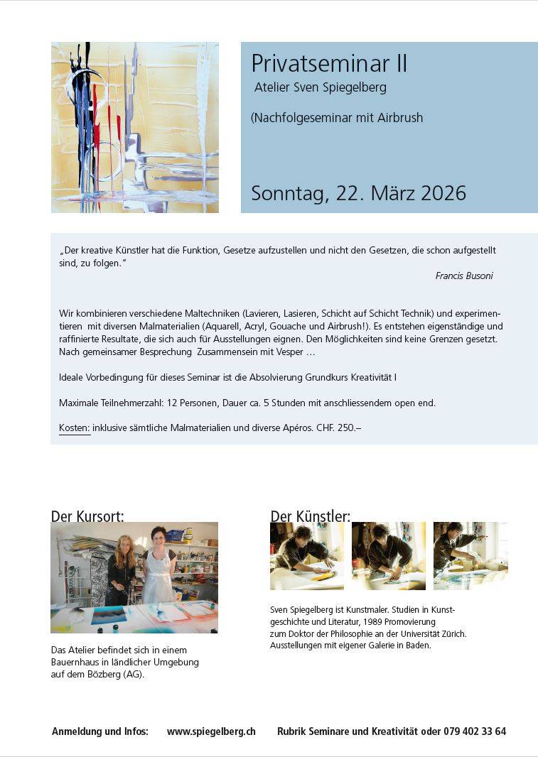 Wir kombinieren verschiedene Maltechniken (Lavieren, Lasieren, Schicht auf Schicht Technik) und experimentieren mit diversen Malmaterialien (Aquarell, Acryl Gouache und Airbrush!) Es entstehen eigenständige und raffinierte Resultate, die sich auch für Ausstellungen eigenen. Den Möglichkeiten sind keine Grenzen gesetzt.