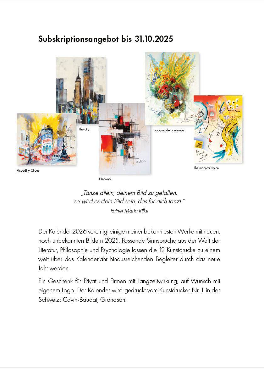 Mit Freude teilen wir mit, dass auch im kommenden Jahr ein neuer Kunstkalender erscheinen wird. Er führt in abwechslungsreicher Weise durch meine neuesten Werke, aber auch unbekannte Bilder dürfen neu entdeckt werden!